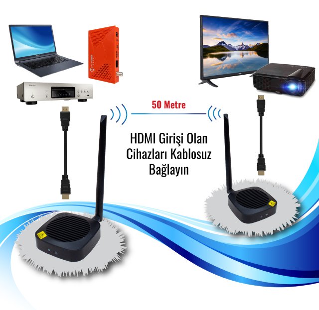 - 50 Metre’ye kadar kablosuz Wifi ile HDMI video ve ses iletimi