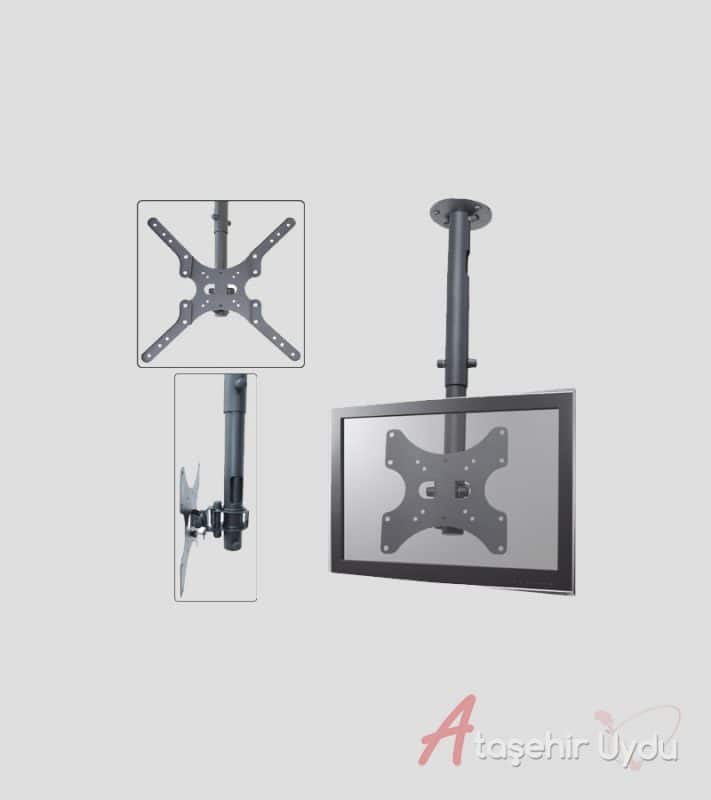 LCD TV, Plazma, Led tv yeni nesil tüm televizyonların tavana montajı mümkündür. LCD LED TV Tavana Montaj Yapılırken hareketli aparat seçilmesi daha doğru olacaktır. Örnek olarak resimde gördüğünüz Tavan Askı Aparatı, hareketlidir. Kendi etrafında 360° dönebilme özelliğine sahiptir. Yukarı ve aşağı 15° hareket edebilir.